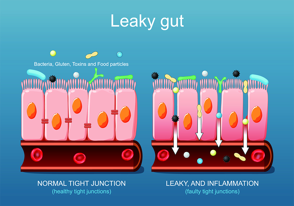 Leaky gut. Close-up of cells of a intestinal epithelium. Difference between Healthy cells, and inflamed intestinal cells. Comparison normal tissue of the gastrointestinal tract, and Intestinal permeability.