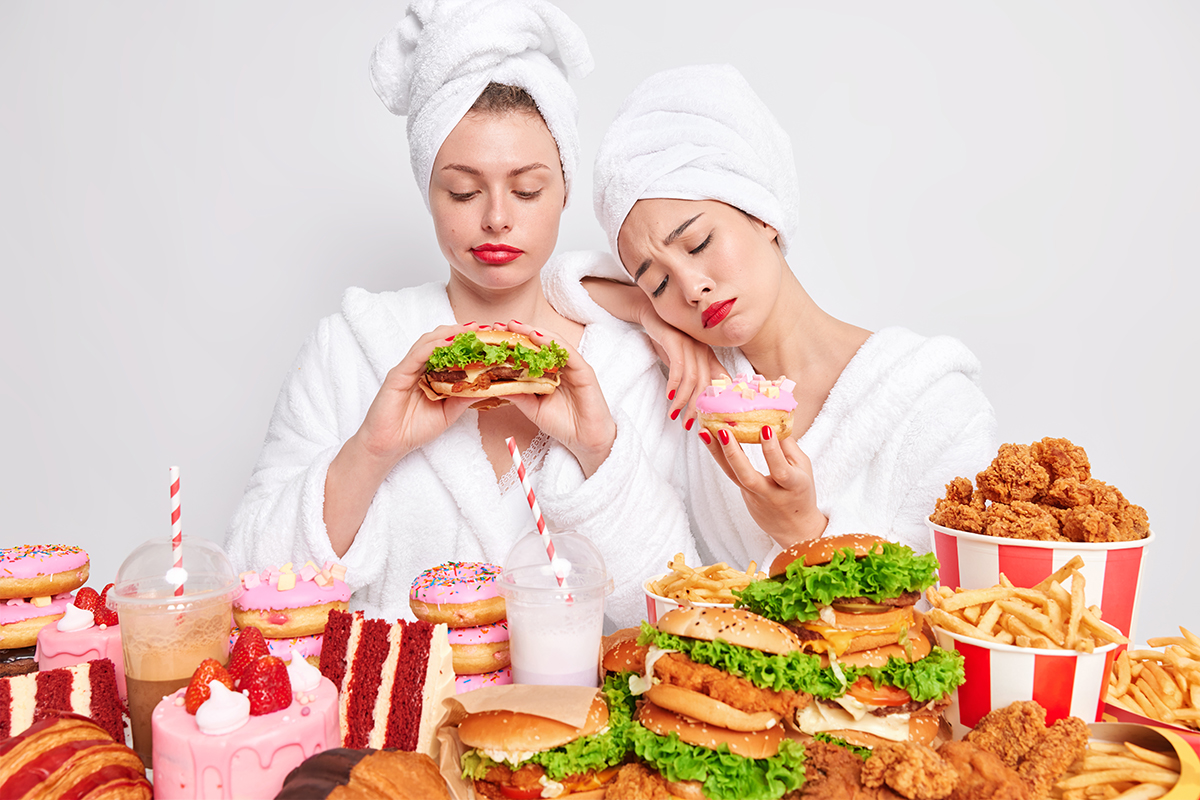Unhappy young women tempting to eats something delicious surrounded by junk food keep to diet and healthy nutrition feel hungry look sadly at tasty burger sweet doughnut.