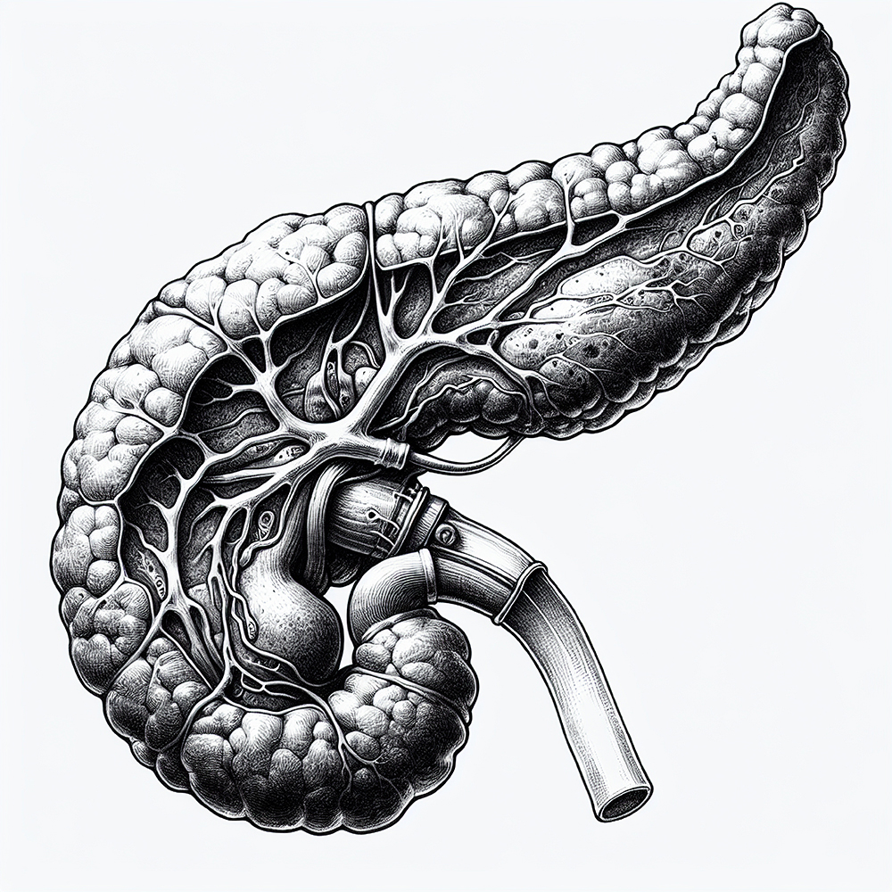 Draw a human pancreas in a black and white sketch style.